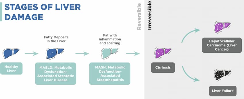 Gan hoạt động tốt đóng vai trò quan trọng đối với sức khỏe tổng thể của chúng ta, với hơn 500 chức năng then chốt bao gồm giải độc máu, sản xuất mật để hỗ trợ tiêu hóa, lưu trữ năng lượng, tổng hợp protein, điều hòa hormone và chức năng miễn dịch. Tuy nhiên, tỷ lệ tử vong do bệnh gan đã tăng gấp đôi trong hai mươi năm qua ở Vương quốc Anh (1). Trên toàn cầu, người ta ước tính cứ bốn người trên thế giới thì có một người mắc bệnh này và các triệu chứng thường không xuất hiện cho đến khi bệnh đã ở giai đoạn không thể hồi phục, như được thể hiện trong hình ảnh bên dưới (2). Đây là lý do tại sao bệnh gan được mệnh danh là ‘kẻ giết người thầm lặng’.
