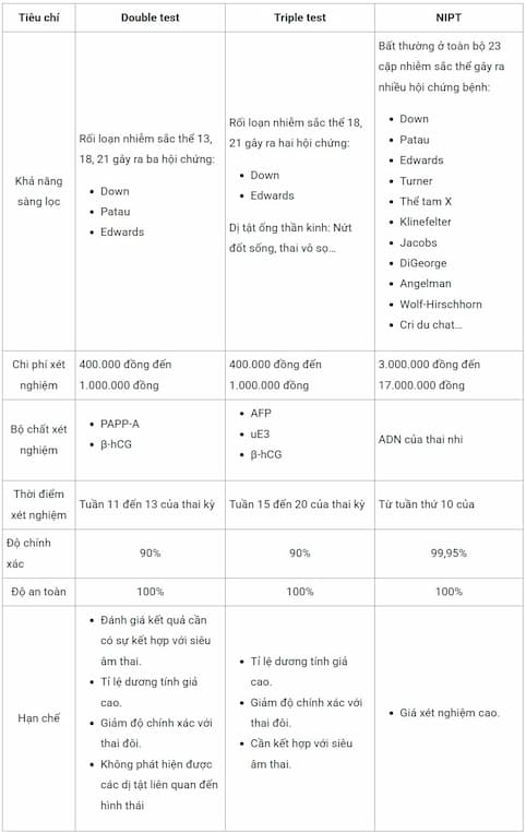 Tiêu chí Double Test Triple Test NIPT