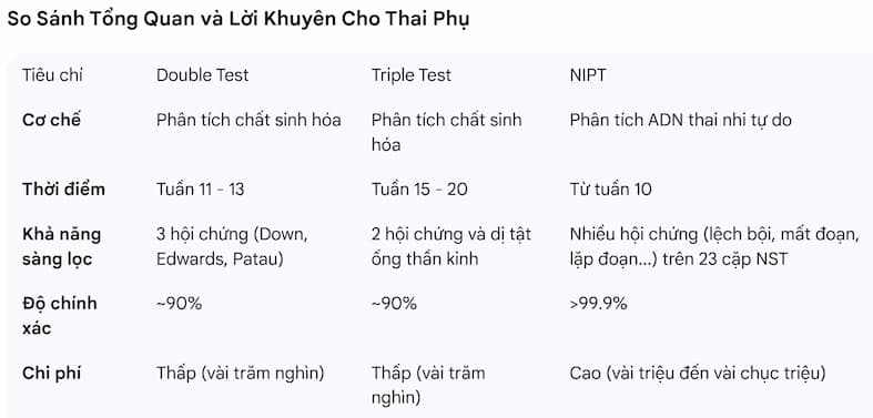 Lựa chọn tối ưu: Với độ chính xác vượt trội và khả năng sàng lọc toàn diện, NIPT đang dần trở thành tiêu chuẩn vàng trong sàng lọc trước sinh. Nếu có điều kiện, việc thực hiện NIPT ngay từ đầu sẽ giúp bạn hoàn toàn an tâm và không cần thực hiện thêm các xét nghiệm sàng lọc khác. Hãy luôn tham khảo ý kiến của bác sĩ để có quyết định phù hợp nhất với thai kỳ của mình.
